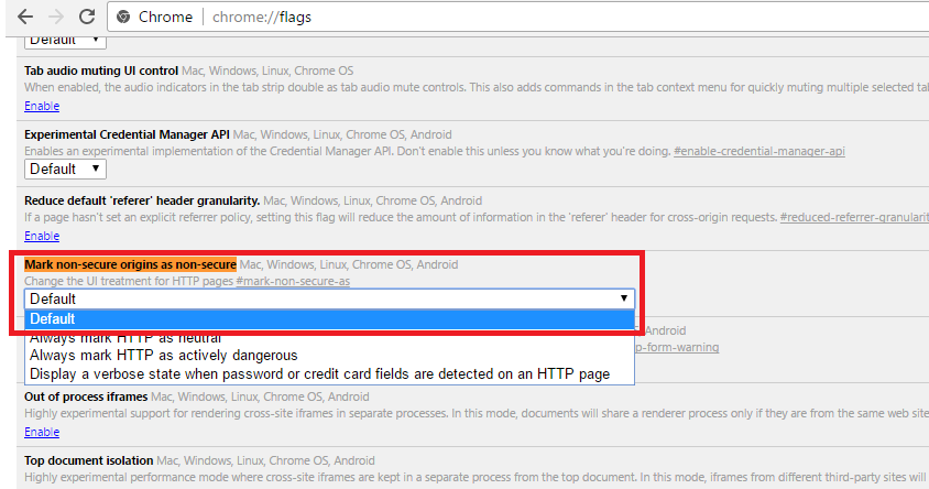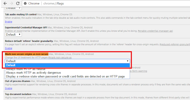 - البحث عن خيار Mark non-secure origins as non-secure ثم تغير خيار Always mark HTTP as neutral