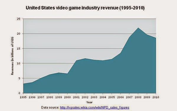 و مع بداية القرن الواحد و العشرين و ظهور منصات الألعاب التي تعمل على الأقراص كالبلايستيشن ، الإكسبوكس و نيتندو وي ، أصبح عالم الألعاب في تطور و نمو صاروخي و هذه بعض الإحصائيات حول عائدات ألعاب الفيديو في الولايات المتحدة الأمريكية.